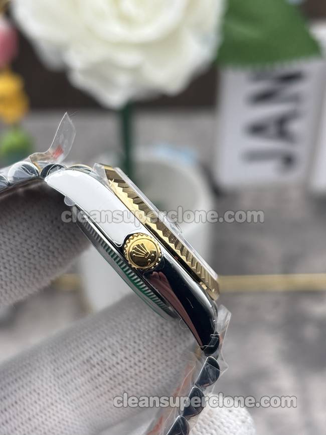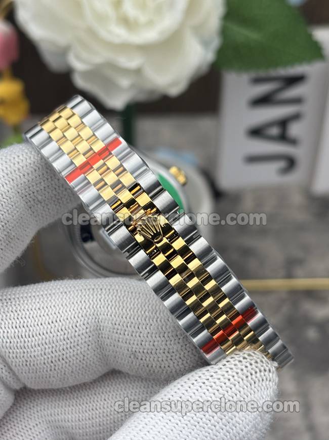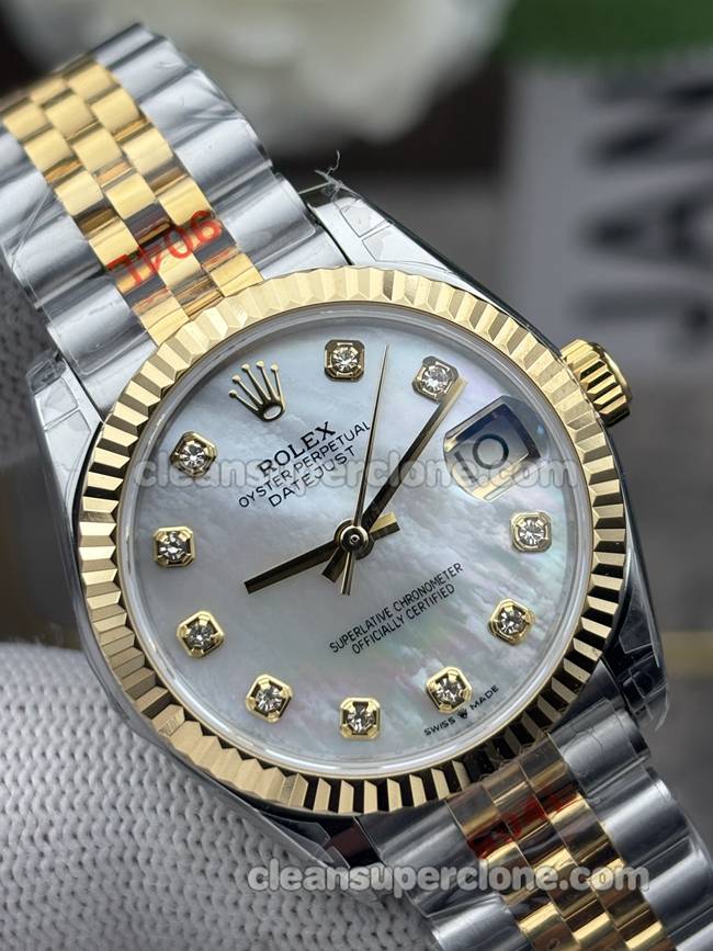 The GS factory Rolex Datejust watch features a 31mm Oystersteel and 18ct gold case. Firstly, its unique mother-of-pearl dial displays radiant colors. Meanwhile, the dial shifts its luster with changing light. Additionally, the classic fluted bezel shines particularly brightly. On the dial, applied Roman numeral markers ensure clear readability.