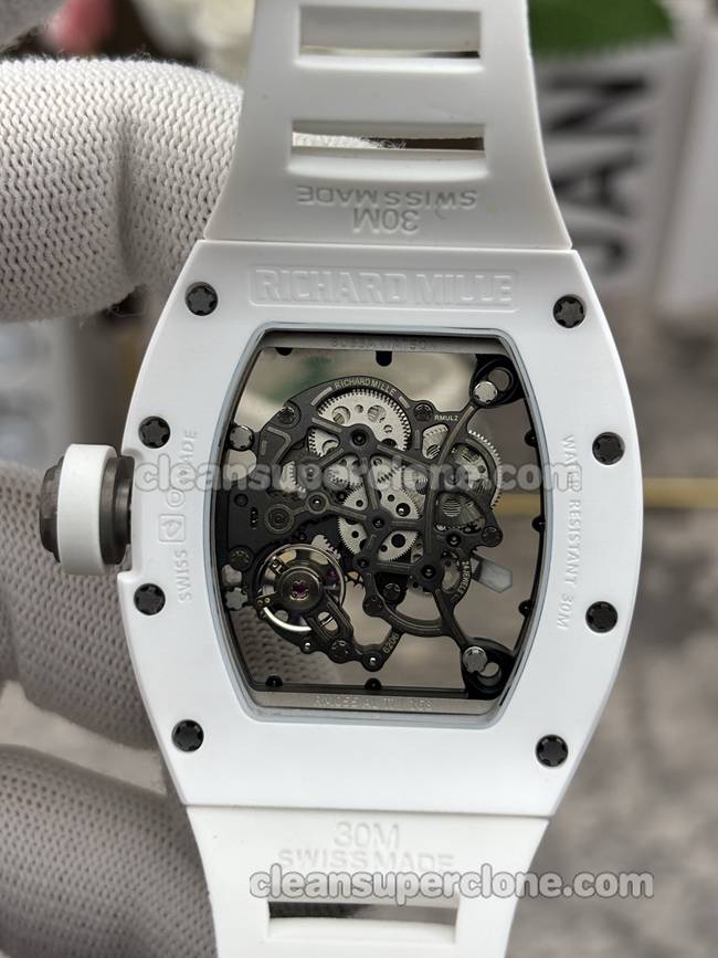 The BBS factory Richard Mille RM055 watch uses high-strength white ceramic for its case. Firstly, this material provides the watch with a unique modern beauty. Meanwhile, it ensures a lightweight and comfortable wearing experience. Additionally, the tonneau-shaped case offers strong brand recognition. The skeletonized dial fully reveals the precise mechanical structure.