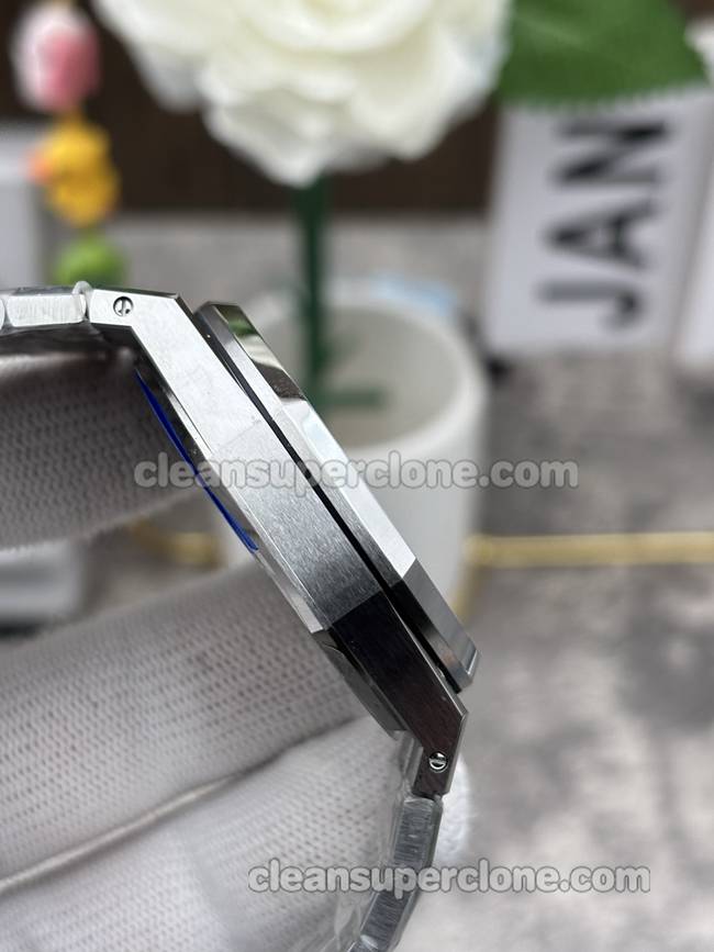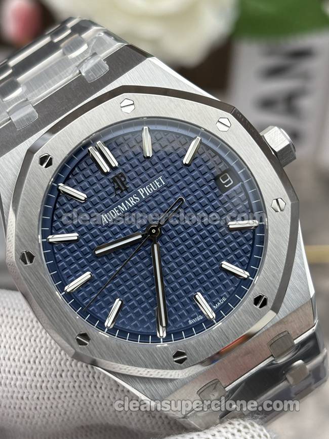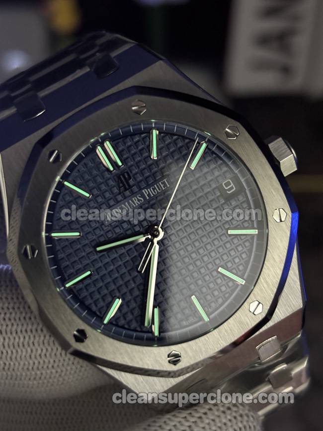 The ZF factory Audemars Piguet Royal Oak watch features a 41mm stainless steel case. Firstly, the blue dial bears the iconic “Grande Tapisserie” pattern. Meanwhile, white gold luminous applied markers and hands stand out distinctly. Additionally, the classic octagonal bezel integrates eight screws. The sapphire crystal, furthermore, offers a clear view of the dial.